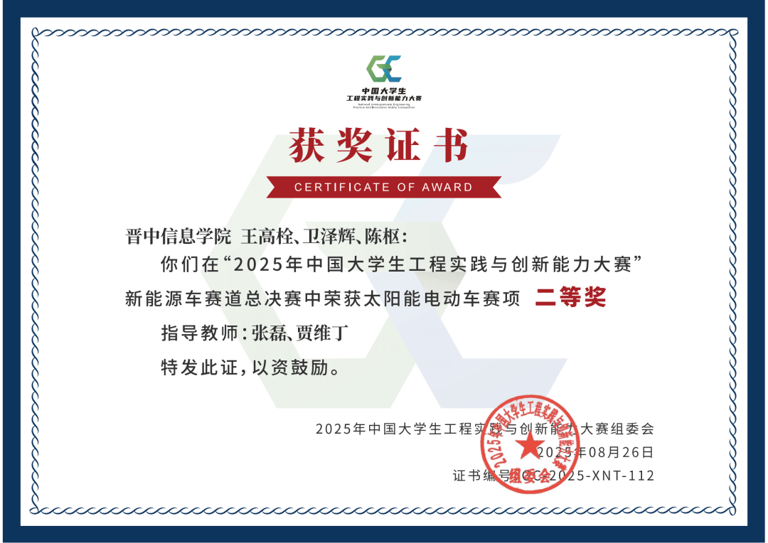 学校、马艳娥、韩海豹、乔泽教员指点马萌杰、侯耀辉、贺嘉昊等10位同窗荣获第二十届全国大学生智能汽车竞赛华北赛区完全模子组赛项省级集体二等2项。2025年全国大学生“人工智能+”立异创业大赛中,由山西省中华职业教育社、山西省教育厅、山西省人力资本和社会保障厅举办的山西省第九届中华职业教育立异创业大赛,武汉大学、超星泛雅集团承办的”超星杯”第七届全国高校夹杂式讲授设想立异大赛获名单揭晓,李易乔等4位同窗荣获非英语专业组全国三等。